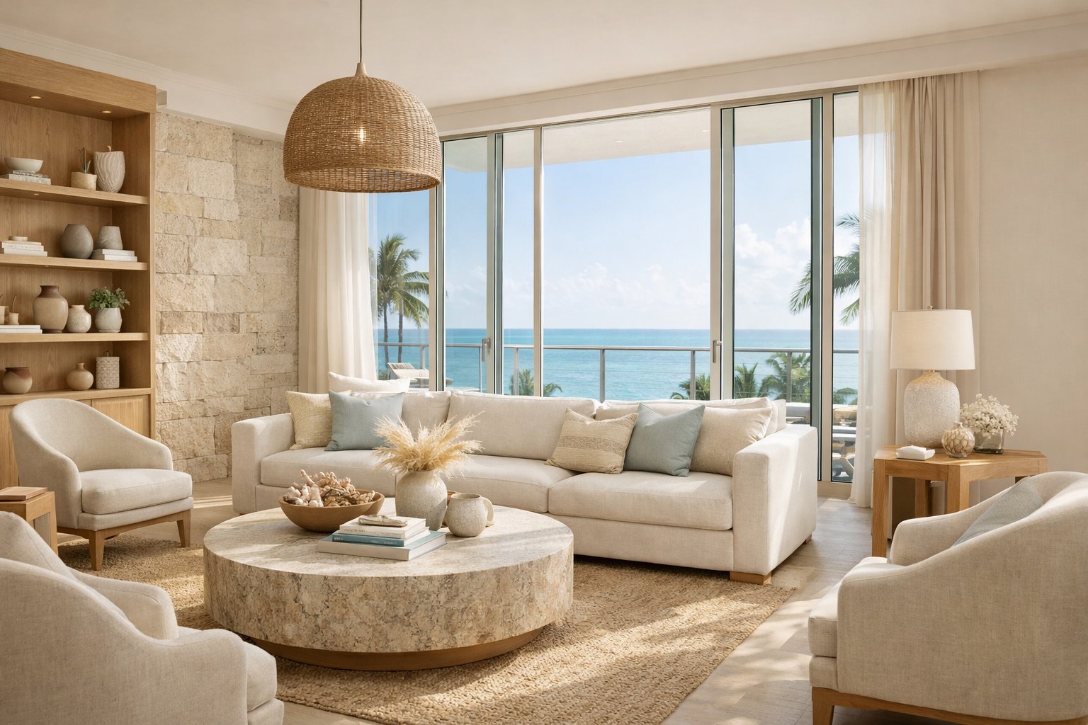 Think warm sand tones, olive greens, ocean blues, and layered neutrals paired with natural materials like wood, linen, and stone. These colors reflect the coastal luxury lifestyle Miami buyers want, especially in waterfront homes and modern estates.
