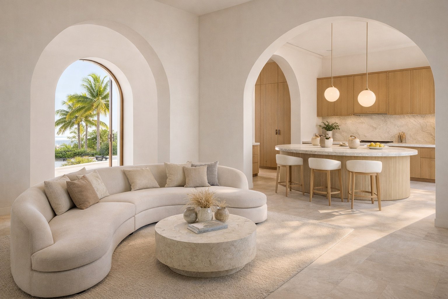 Curved sofas, arched entryways, rounded kitchen islands, and sculptural lighting fixtures are appearing in many newly designed luxury properties across Miami Beach and Coral Gables.